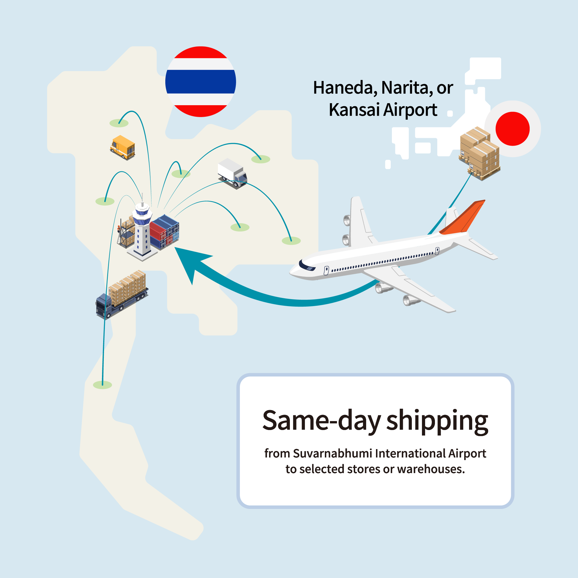 We have developed an exclusive export route for fresh food products from various production areas throughout Japan, arriving at Suvarnabhumi International Airport on same-day flights from Haneda, Narita, or Kansai Airport.