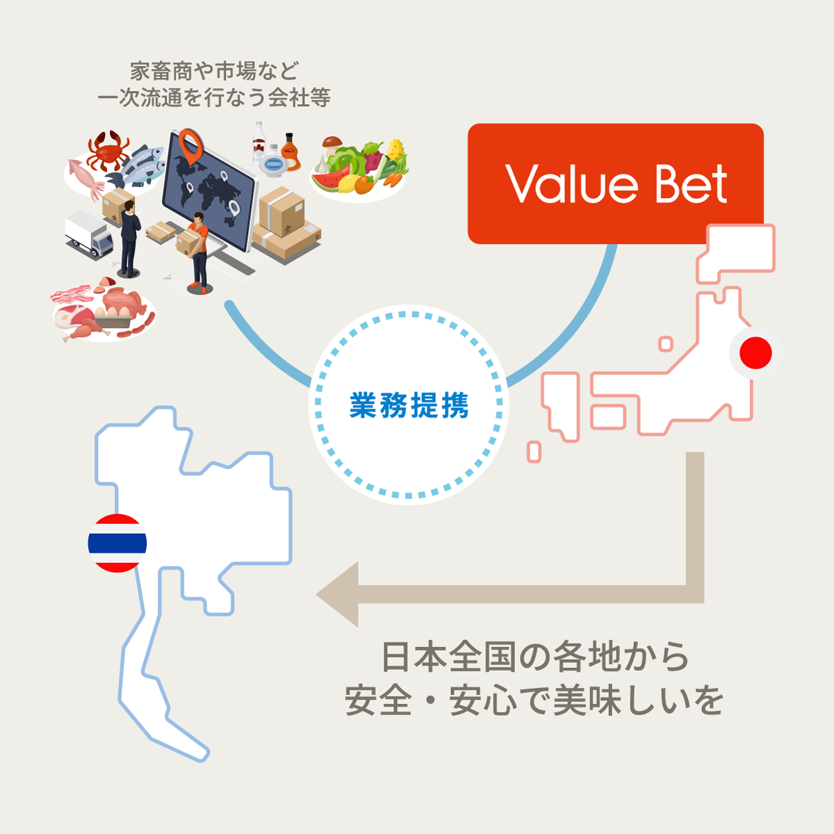 日本が誇る厳選された食材の生産者様の思いと願いを志あるタイのレストランの料理人の方々に受け継ぎ、タイの皆様に感動、健康と幸せをお届けするお手伝いをする事がValue Bet株式会社の使命です。