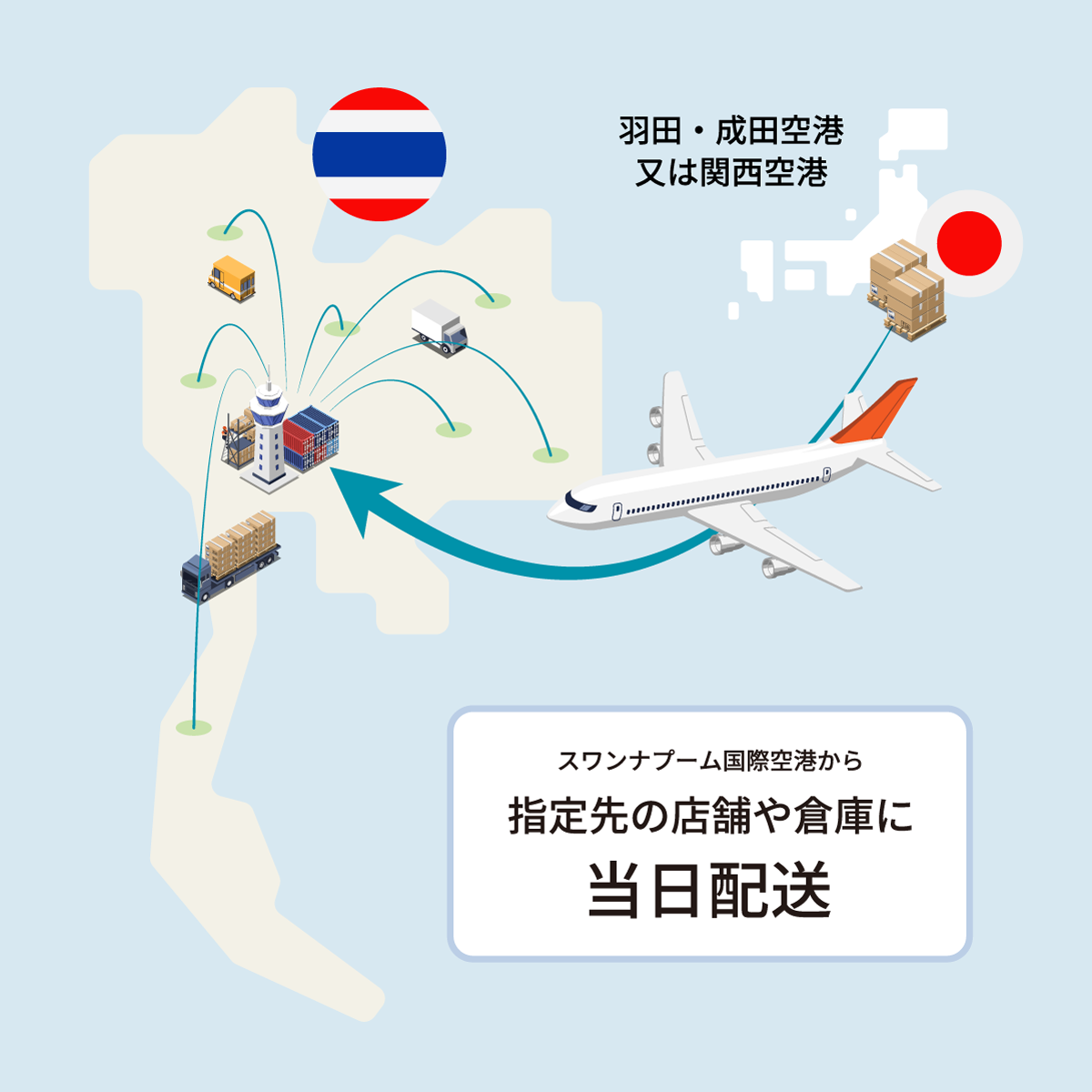 日本全国の各種産地から生鮮食品を空輸便で、当日便にて、羽田・成田空港又は関西空港よりスワンナプーム国際空港に到着する独自の輸出ルートを確立しております。